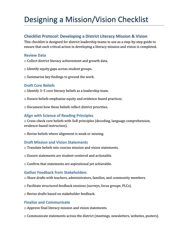Start with a Checklist - This checklist has key steps to design a literacy mission/vision with embedded resources also found in context below.